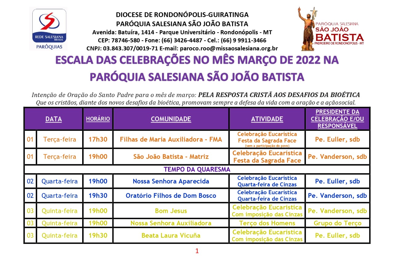 Escala de Celebrações do mês de Março na Paróquia Salesiana São João Batista
