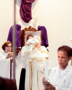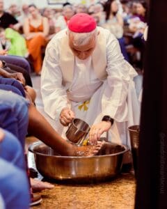 Um dos momentos marcantes desta celebração foi o rito do lava-pés, quando o bispo lavou os pés de 12 pessoas, recordando o gesto de Jesus na última ceia. Entre os escolhidos para esse rito que significa humildade e serviço, estava também sua própria mãe.